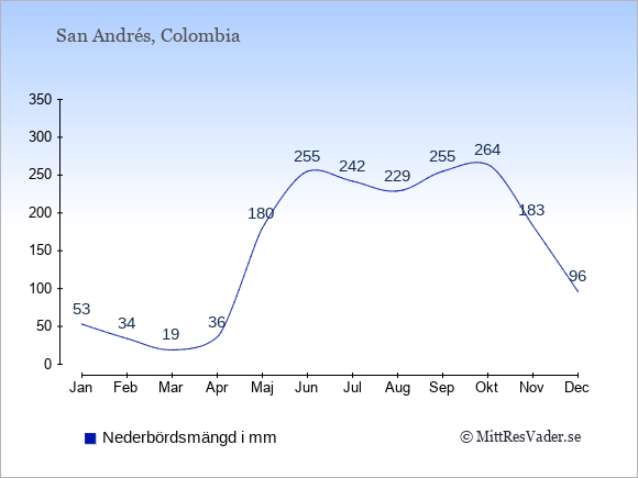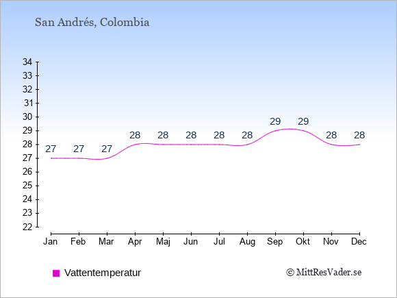 För att se hur vädret på San Andrés skiljer sig från vädret hemma, kan du också jämföra siffrorna måned för måned med motsvarande siffror för Sverige under samma period här: San Andrés klimat.