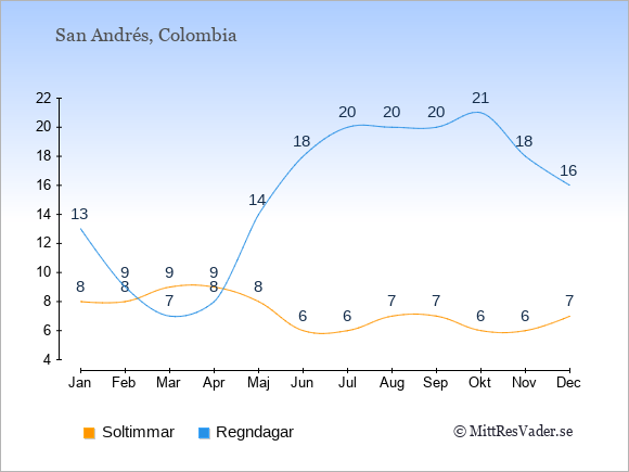Grafen visar det genomsnittliga antalet soltimmar på San Andrés under en viss månad (soltimmar är det antalet timmar per dag där solen skinnar), och antalet regndagar (dvs. det genomsnittliga antalet dagar