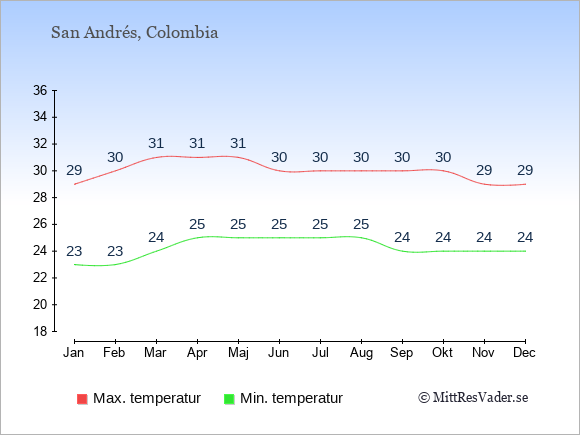 Grafen visar de genomsnittligt högsta temperaturerna på San Andrés (vanligtvis det värde som uppmätts mitt på dagen) och de genomsnittligt lägsta temperaturer (vanligtvis tidpunkten just innan soluppgång).