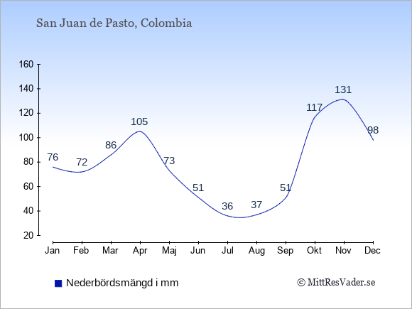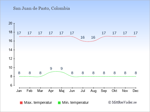 För att se hur vädret i San Juan de Pasto skiljer sig från vädret hemma, kan du också jämföra siffrorna måned för måned med motsvarande siffror för Sverige under samma period här: San Juan de Pastos klimat.