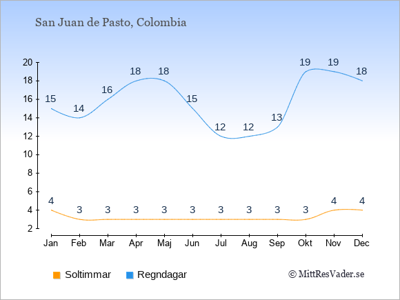 Väder i San Juan de Pasto: Soltimmar och regndagar