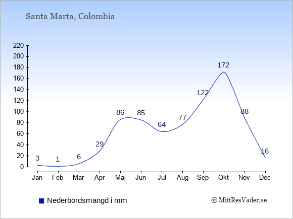 För att se hur vädret i Santa Marta skiljer sig från vädret hemma, kan du också jämföra siffrorna måned för måned med motsvarande siffror för Sverige under samma period här: Santa Martas klimat.