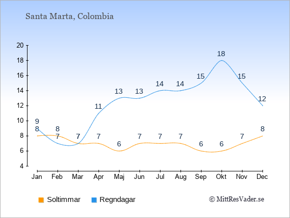 Grafen visar det genomsnittliga antalet soltimmar i Santa Marta under en viss månad (soltimmar är det antalet timmar per dag där solen skinnar), och antalet regndagar (dvs. det genomsnittliga antalet dagar