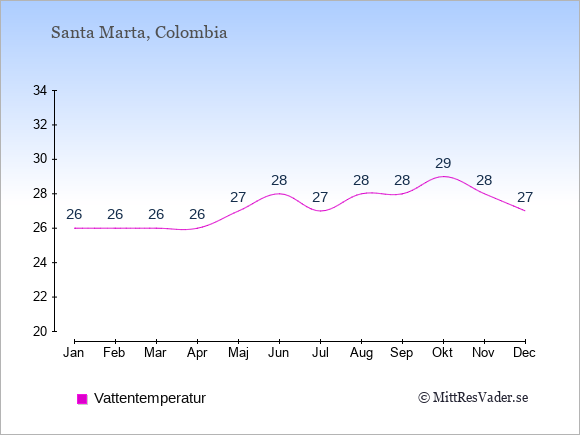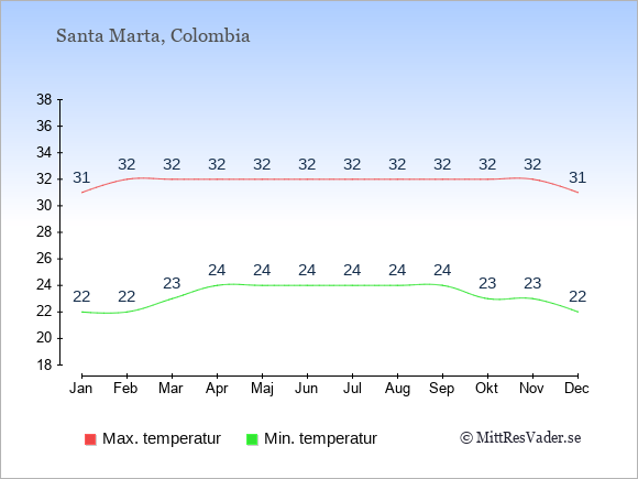Grafen visar de genomsnittligt högsta temperaturerna i Santa Marta (vanligtvis det värde som uppmätts mitt på dagen) och de genomsnittligt lägsta temperaturer (vanligtvis tidpunkten just innan soluppgång).