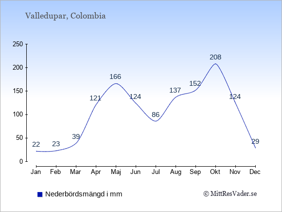 För att se hur vädret i Valledupar skiljer sig från vädret hemma, kan du också jämföra siffrorna måned för måned med motsvarande siffror för Sverige under samma period här: Valledupars klimat.