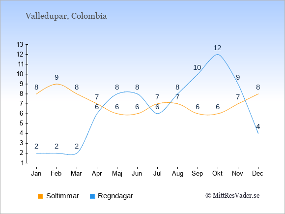 Grafen visar det genomsnittliga antalet soltimmar i Valledupar under en viss månad (soltimmar är det antalet timmar per dag där solen skinnar), och antalet regndagar (dvs. det genomsnittliga antalet dagar