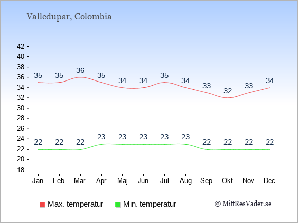 Grafen visar de genomsnittligt högsta temperaturerna i Valledupar (vanligtvis det värde som uppmätts mitt på dagen) och de genomsnittligt lägsta temperaturer (vanligtvis tidpunkten just innan soluppgång).