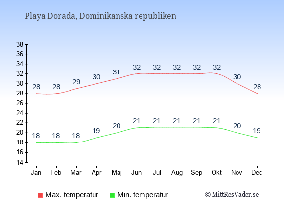 Grafen visar de genomsnittligt högsta temperaturerna i Playa Dorada (vanligtvis det värde som uppmätts mitt på dagen) och de genomsnittligt lägsta temperaturer (vanligtvis tidpunkten just innan soluppgång).