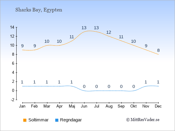 Grafen visar det genomsnittliga antalet soltimmar i Sharks Bay under en viss månad (soltimmar är det antalet timmar per dag där solen skinnar), och antalet regndagar (dvs. det genomsnittliga antalet dagar