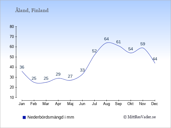 Få en överblick över vädret på Åland månad för månad med temperaturer, vattentemperatur, soltimmar och nederbörd.