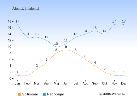 Grafen visar det genomsnittliga antalet soltimmar på Åland under en viss månad (soltimmar är det antalet timmar per dag där solen skinnar), och antalet regndagar (dvs. det genomsnittliga antalet dagar