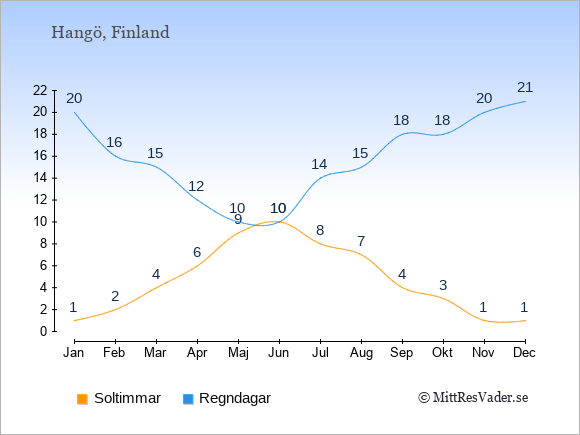 Grafen visar det genomsnittliga antalet soltimmar i Hangö under en viss månad (soltimmar är det antalet timmar per dag där solen skinnar), och antalet regndagar (dvs. det genomsnittliga antalet dagar