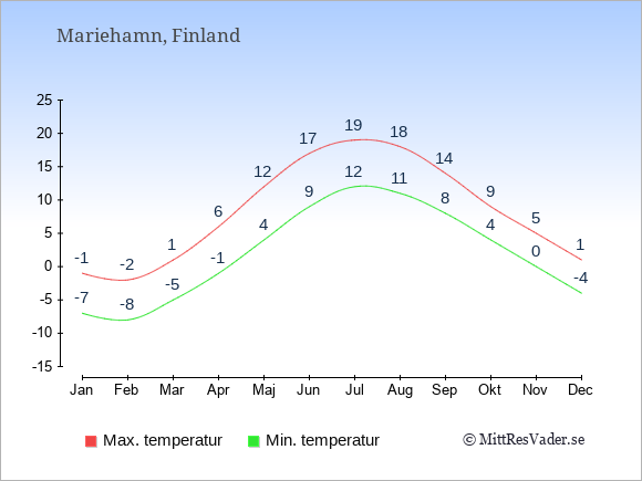 Grafen visar de genomsnittligt högsta temperaturerna i Mariehamn (vanligtvis det värde som uppmätts mitt på dagen) och de genomsnittligt lägsta temperaturer (vanligtvis tidpunkten just innan soluppgång).