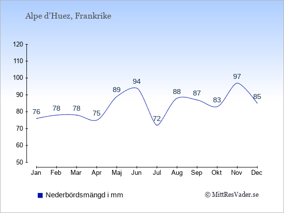 Väder i Alpe d'Huez: Soltimmar och regndagar