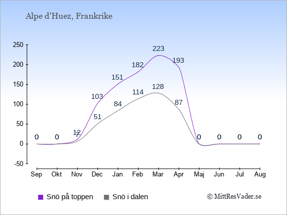 Genomsnittligt väder i Alpe d'Huez, Frankrike