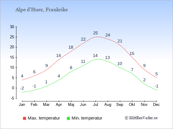 Grafen visar de genomsnittligt högsta temperaturerna i Alpe d'Huez (vanligtvis det värde som uppmätts mitt på dagen) och de genomsnittligt lägsta temperaturer (vanligtvis tidpunkten just innan soluppgång).