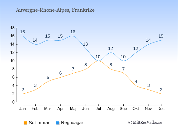 Grafen visar det genomsnittliga antalet soltimmar i Auvergne-Rhone-Alpes under en viss månad (soltimmar är det antalet timmar per dag där solen skinnar), och antalet regndagar (dvs. det genomsnittliga antalet dagar