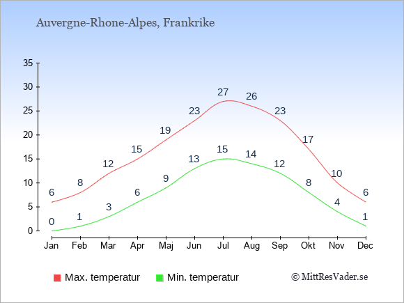Grafen visar de genomsnittligt högsta temperaturerna i Auvergne-Rhone-Alpes (vanligtvis det värde som uppmätts mitt på dagen) och de genomsnittligt lägsta temperaturer (vanligtvis tidpunkten just innan soluppgång).