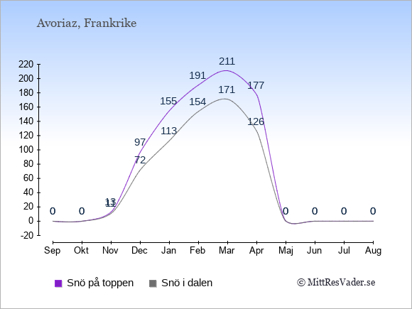 Informationen om Avoriaz väder kommer från dalen. Typiskt sjunker temperaturen med cirka en grad för varje 200 meter ju högre upp du kommer i backen. Högre upp i skidområdet kan därför vara betydligt kallare än diagrammet visar.