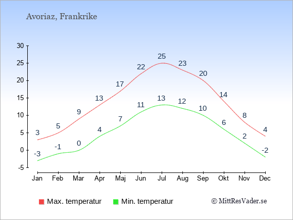Grafen visar de genomsnittligt högsta temperaturerna i Avoriaz (vanligtvis det värde som uppmätts mitt på dagen) och de genomsnittligt lägsta temperaturer (vanligtvis tidpunkten just innan soluppgång).