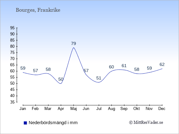 För att se hur vädret i Bourges skiljer sig från vädret hemma, kan du också jämföra siffrorna måned för måned med motsvarande siffror för Sverige under samma period här: Bourges klimat.
