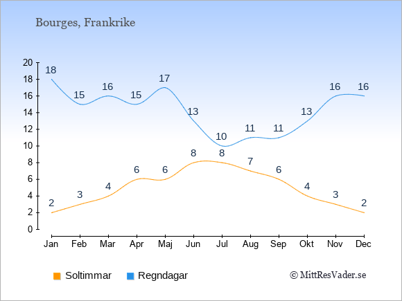 Grafen visar det genomsnittliga antalet soltimmar i Bourges under en viss månad (soltimmar är det antalet timmar per dag där solen skinnar), och antalet regndagar (dvs. det genomsnittliga antalet dagar