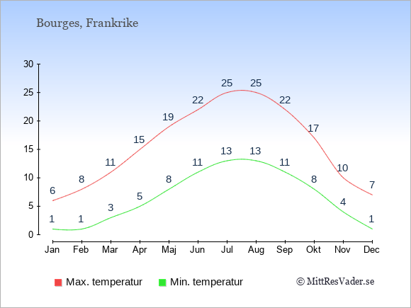 Grafen visar de genomsnittligt högsta temperaturerna i Bourges (vanligtvis det värde som uppmätts mitt på dagen) och de genomsnittligt lägsta temperaturer (vanligtvis tidpunkten just innan soluppgång).