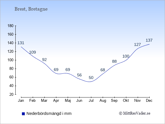 För att se hur vädret i Brest skiljer sig från vädret hemma, kan du också jämföra siffrorna måned för måned med motsvarande siffror för Sverige under samma period här: Brests klimat.