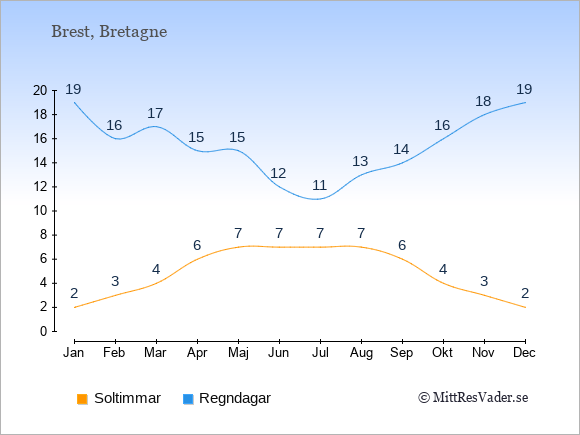 Grafen visar det genomsnittliga antalet soltimmar i Brest under en viss månad (soltimmar är det antalet timmar per dag där solen skinnar), och antalet regndagar (dvs. det genomsnittliga antalet dagar