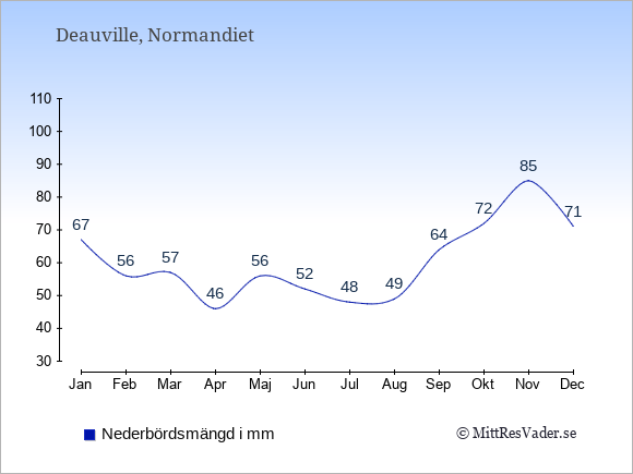 För att se hur vädret i Deauville skiljer sig från vädret hemma, kan du också jämföra siffrorna måned för måned med motsvarande siffror för Sverige under samma period här: Deauvilles klimat.