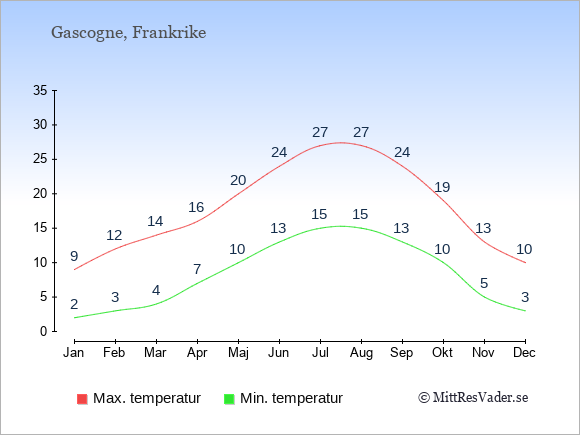 Grafen visar de genomsnittligt högsta temperaturerna i Gascogne (vanligtvis det värde som uppmätts mitt på dagen) och de genomsnittligt lägsta temperaturer (vanligtvis tidpunkten just innan soluppgång).