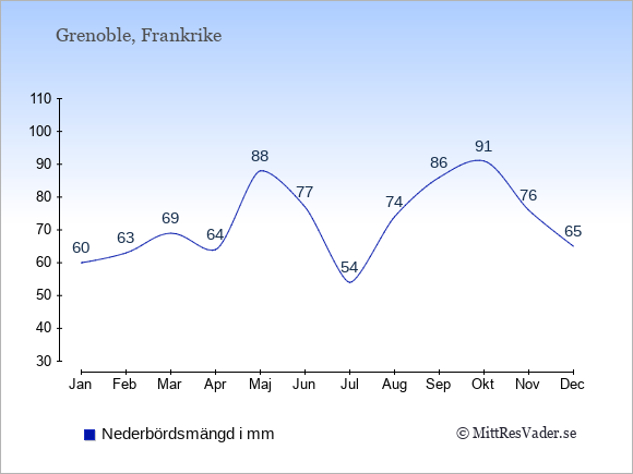 Väder i Grenoble: Soltimmar och regndagar