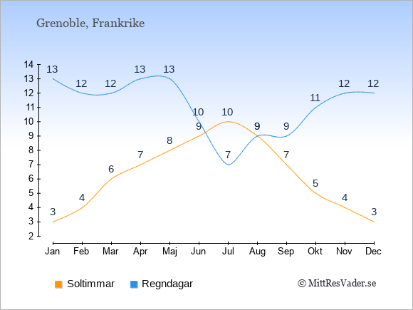 Grafen visar det genomsnittliga antalet soltimmar i Grenoble under en viss månad (soltimmar är det antalet timmar per dag där solen skinnar), och antalet regndagar (dvs. det genomsnittliga antalet dagar