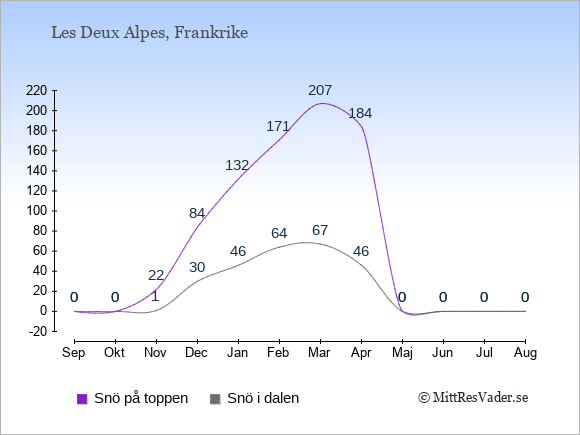 Den historiska snörapporten för Les Deux Alpes visar den genomsnittliga mängden snö i Les Deux Alpes under de senaste 5 åren. Siffrorna är sammanställda i antal centimeter snö (snödjup) både på toppen av backarna och i dalen.