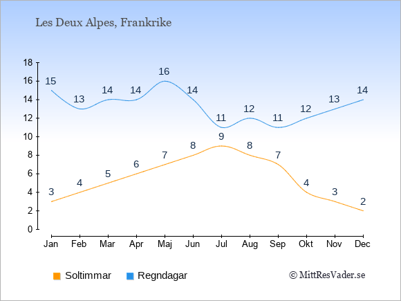 Grafen visar det genomsnittliga antalet soltimmar i Les Deux Alpes under en viss månad (soltimmar är det antalet timmar per dag där solen skinnar), och antalet regndagar (dvs. det genomsnittliga antalet dagar