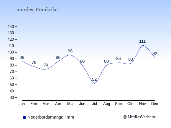 För att se hur vädret i Lourdes skiljer sig från vädret hemma, kan du också jämföra siffrorna måned för måned med motsvarande siffror för Sverige under samma period här: Lourdes klimat.