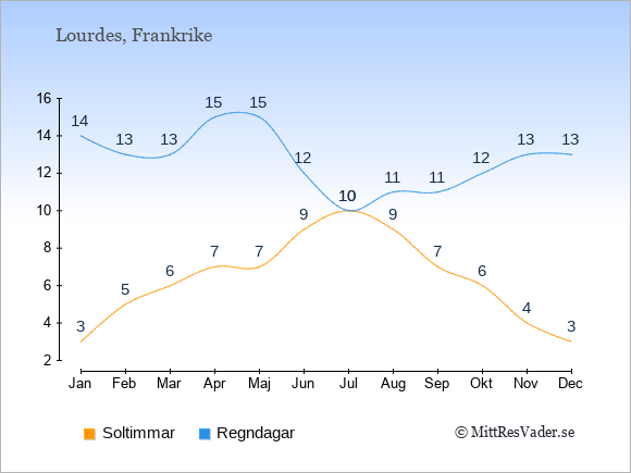 Grafen visar det genomsnittliga antalet soltimmar i Lourdes under en viss månad (soltimmar är det antalet timmar per dag där solen skinnar), och antalet regndagar (dvs. det genomsnittliga antalet dagar