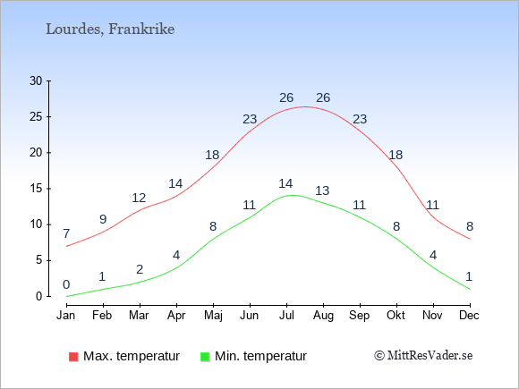 Grafen visar de genomsnittligt högsta temperaturerna i Lourdes (vanligtvis det värde som uppmätts mitt på dagen) och de genomsnittligt lägsta temperaturer (vanligtvis tidpunkten just innan soluppgång).