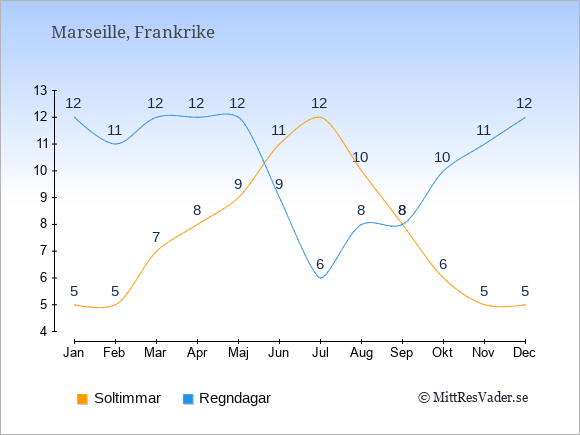 Grafen visar det genomsnittliga antalet soltimmar i Marseille under en viss månad (soltimmar är det antalet timmar per dag där solen skinnar), och antalet regndagar (dvs. det genomsnittliga antalet dagar