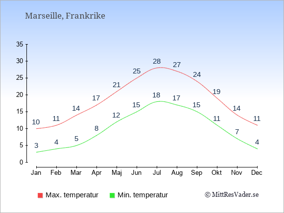 Grafen visar de genomsnittligt högsta temperaturerna i Marseille (vanligtvis det värde som uppmätts mitt på dagen) och de genomsnittligt lägsta temperaturer (vanligtvis tidpunkten just innan soluppgång).