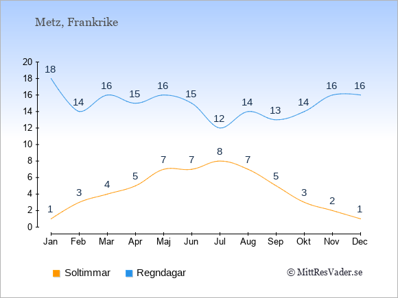 Grafen visar det genomsnittliga antalet soltimmar i Metz under en viss månad (soltimmar är det antalet timmar per dag där solen skinnar), och antalet regndagar (dvs. det genomsnittliga antalet dagar