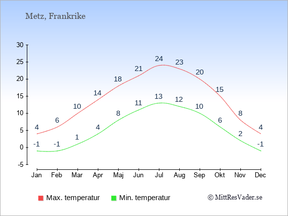 Grafen visar de genomsnittligt högsta temperaturerna i Metz (vanligtvis det värde som uppmätts mitt på dagen) och de genomsnittligt lägsta temperaturer (vanligtvis tidpunkten just innan soluppgång).