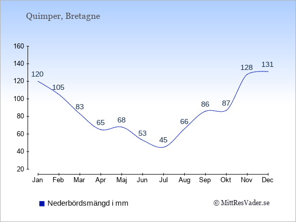 För att se hur vädret i Quimper skiljer sig från vädret hemma, kan du också jämföra siffrorna måned för måned med motsvarande siffror för Sverige under samma period här: Quimpers klimat.