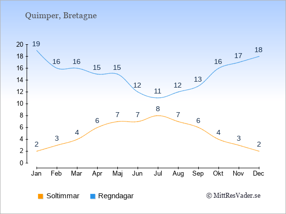Grafen visar det genomsnittliga antalet soltimmar i Quimper under en viss månad (soltimmar är det antalet timmar per dag där solen skinnar), och antalet regndagar (dvs. det genomsnittliga antalet dagar