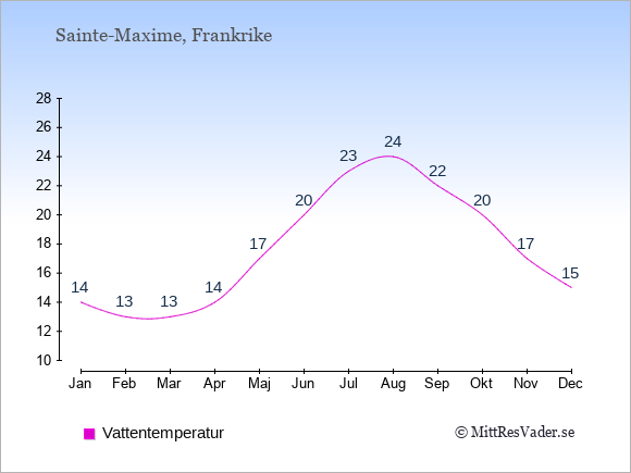 För att se hur vädret i Sainte-Maxime skiljer sig från vädret hemma, kan du också jämföra siffrorna måned för måned med motsvarande siffror för Sverige under samma period här: Sainte-Maximes klimat.