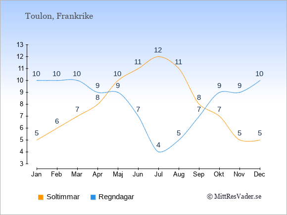 Grafen visar det genomsnittliga antalet soltimmar i Toulon under en viss månad (soltimmar är det antalet timmar per dag där solen skinnar), och antalet regndagar (dvs. det genomsnittliga antalet dagar