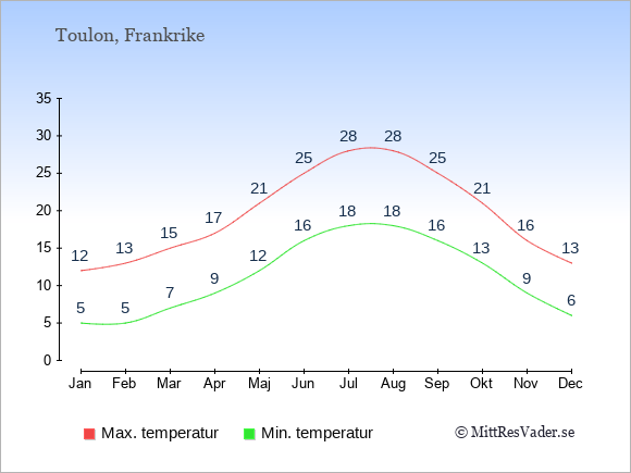 Grafen visar de genomsnittligt högsta temperaturerna i Toulon (vanligtvis det värde som uppmätts mitt på dagen) och de genomsnittligt lägsta temperaturer (vanligtvis tidpunkten just innan soluppgång).