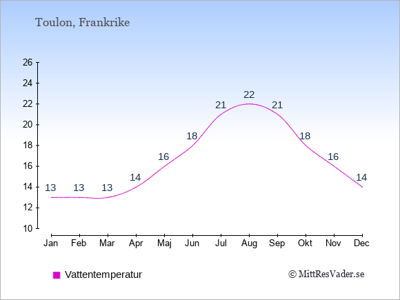 För att se hur vädret i Toulon skiljer sig från vädret hemma, kan du också jämföra siffrorna måned för måned med motsvarande siffror för Sverige under samma period här: Toulons klimat.