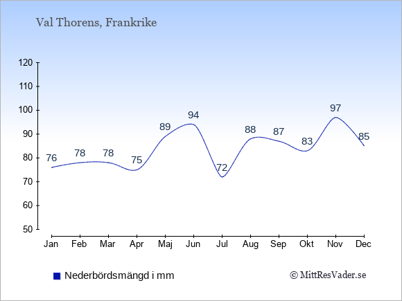 Vädret i Val Thorens är oftast bäst i de månader där det finns många soltimmar och få dagars nederbörd.