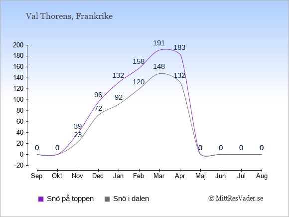 Grafen visar de genomsnittligt högsta temperaturerna i Val Thorens (vanligtvis det värde som uppmätts mitt på dagen) och de genomsnittligt lägsta temperaturer (vanligtvis tidpunkten just innan soluppgång).